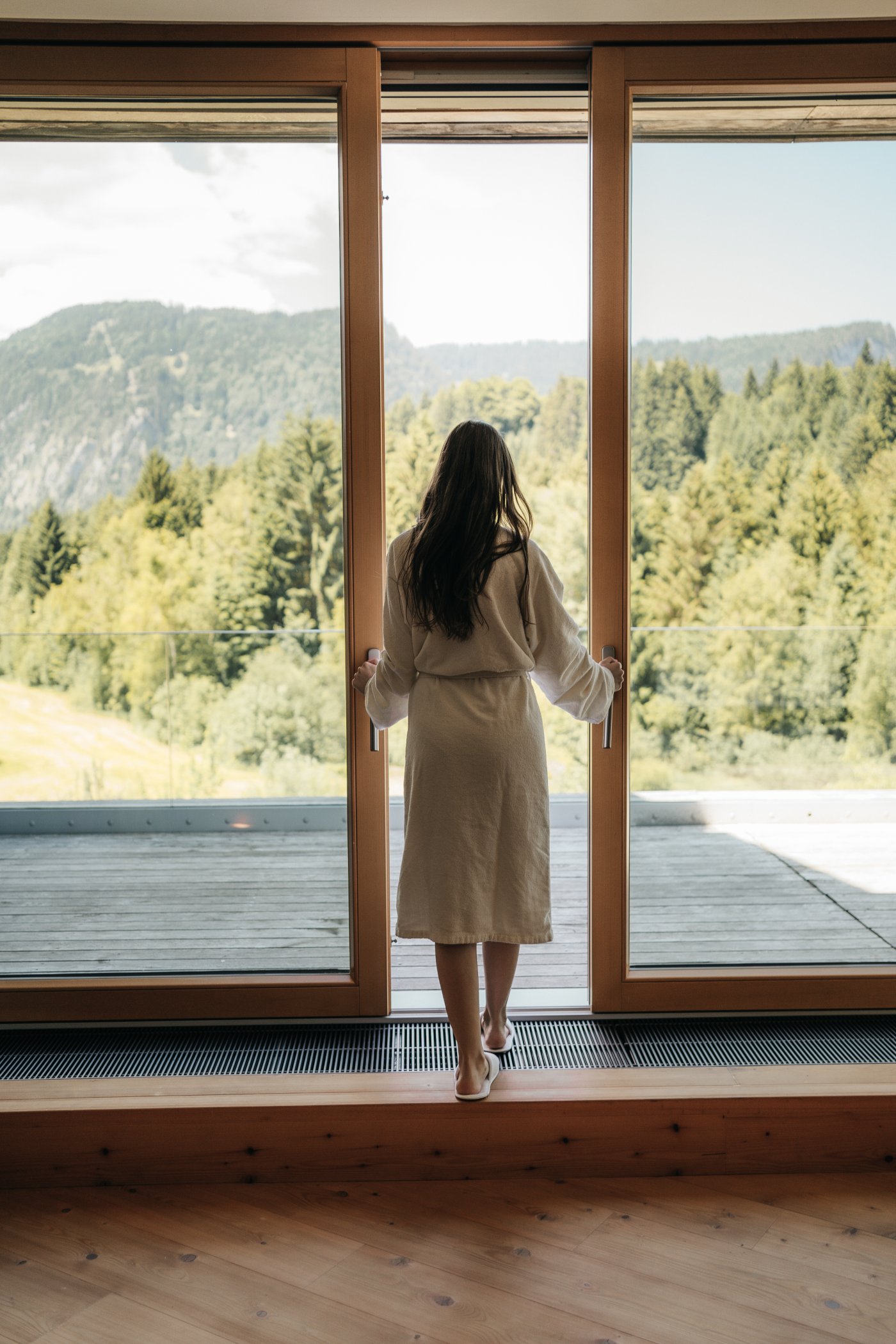 Die Zimmer verbinden modernen Komfort mit alpiner Gemütlichkeit. Durch große Fenster öffnet sich ein weiter Panoramablick auf die Allgäuer Berge, sodass Du die Natur direkt vom Zimmer aus genießen kannst – ideal, um den Alltag hinter Dir zu lassen.